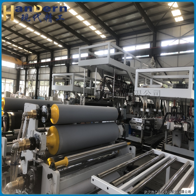 蜂窩板生產(chǎn)線采用擠出法一次成型工藝, 以PP為主要原料,生產(chǎn)三層夾心板材,兩面為較薄的面層,中間為蜂窩的結(jié)構(gòu)可以分層單層板、雙層板。PP蜂窩板也可以一次成型雙面貼布、覆膜,具有重量輕、剛度好、環(huán)保減震耐寒、隔音保溫、防潮隔熱等優(yōu)點(diǎn)。
